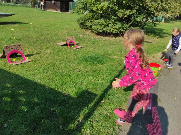 V pátek 8. října 2021 se ve školní družině uskutečnila akce s názvem Biatlon. Děti byly rozděleny do dvou družstev. Úkolem bylo uběhnout 200 m, a poté se míčkem trefit na cíl. Sluníčko krásně svítilo a všichni naši závodníci si soutěžení velmi užívali, což bylo znát i z hlasitého povzbuzování. Na konci nás jako vždy čekala zasloužená odměna.