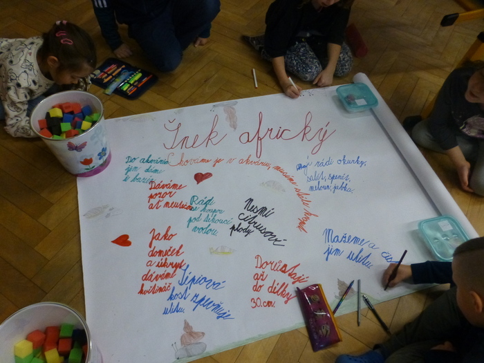 V pondělí k nám přišla nová paní asistentka s mláďátky šneka afrického. Mládě bylo velké jako normální u nás žijící šnek. Dozvěděli jsme se, že dorůstají v dospělosti až do délky 30 cm a dožívají se 10 let. Živí se okurkami, sépiovou kostí, banány, melouny a někdy sní i maso. Šnek se nesmí pouštět mimo terárium. Mohl by utéct, rychle se rozmnožit a užírat úrodu. Paní nám také řekla, že má doma i pavouky, psa, kočku, cvrčky a měli dokonce i hada .Nyní už víme, že šneci afričtí jsou noční zvířata a mají rádi vlhko. Byla to fajn hodina. O africké šneky se starají žáci 3. ročníku, pokusí se z mláďat vychovat dospělé jedince. Kateřina Orálková, žákyně 2. třídy