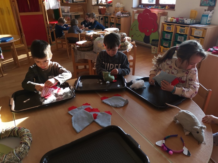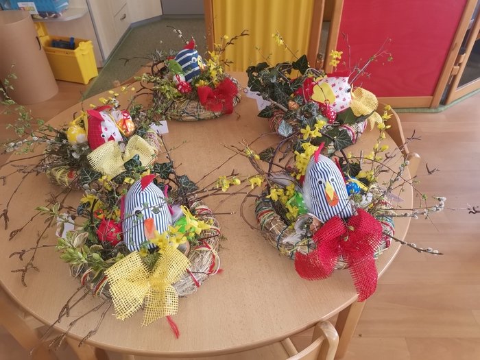 Minulý týden proběhly v naší mateřské škole tradiční velikonoční dílny. Děti si za pomoci paní učitelek vyrobily velikonoční věneček se slepičkou a kraslicemi a přáníčko. Jarní dekorace se dětem moc povedla.